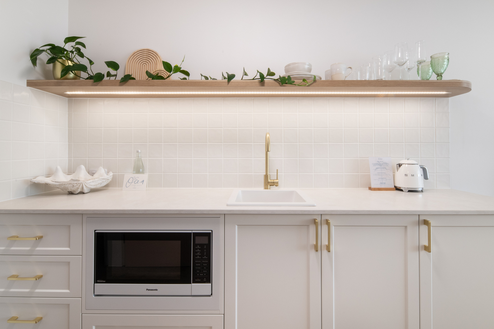 Kitchenette featuring Smeg appliances, T2 Teas and Nespresso coffee machine.